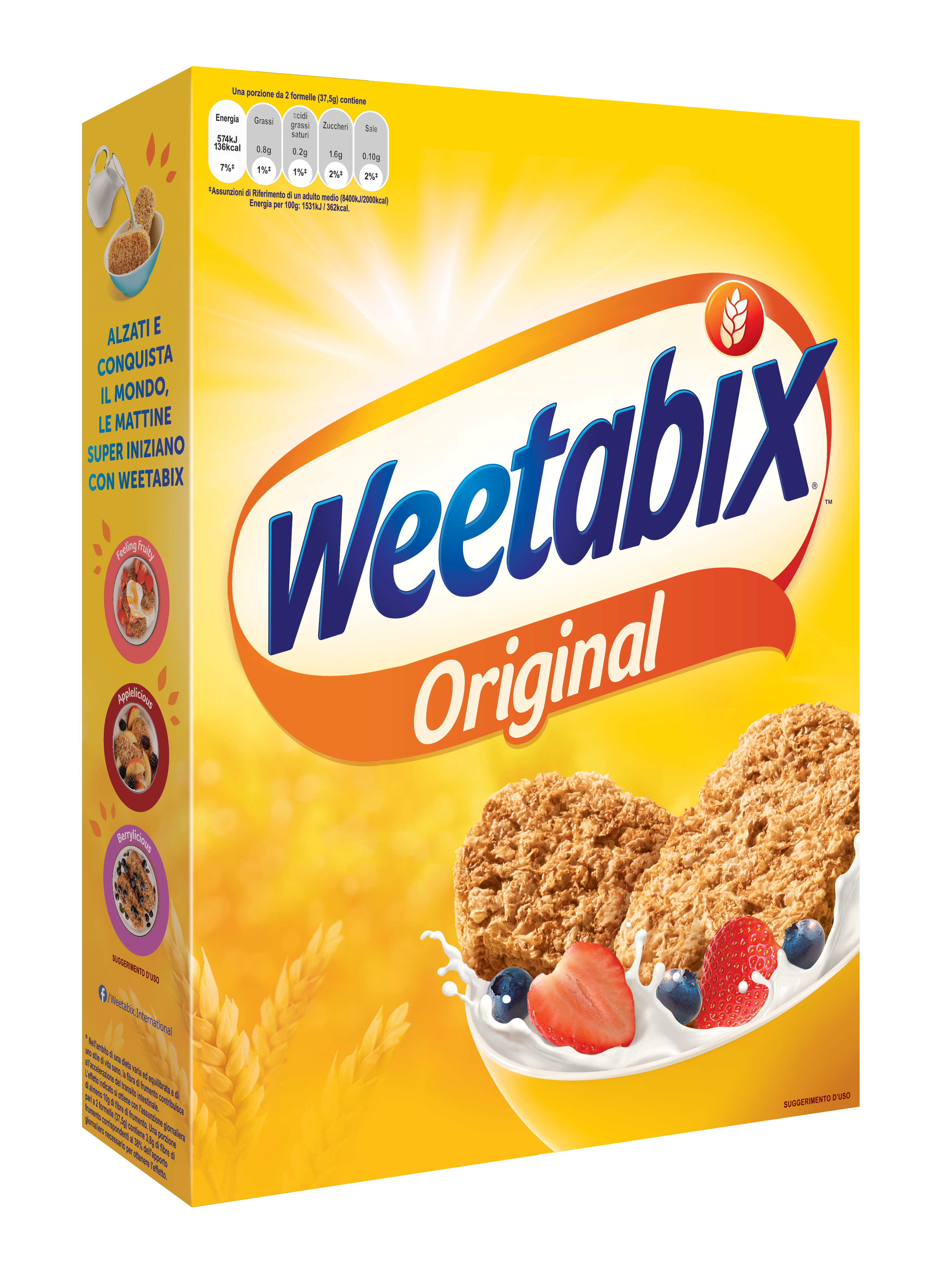 I Weetabix sono una colazione piena di sostanze nutrienti* e gustosa, realizzata con cereali integrali al 100% e con l’aggiunta delle vitamine necessarie per affrontare al massimo la tua mattina!